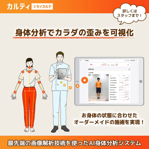 当院ではAI技術を使った専門的な姿勢分析を行い、 体のゆがみや不調の原因を分かりやすくチェックします。